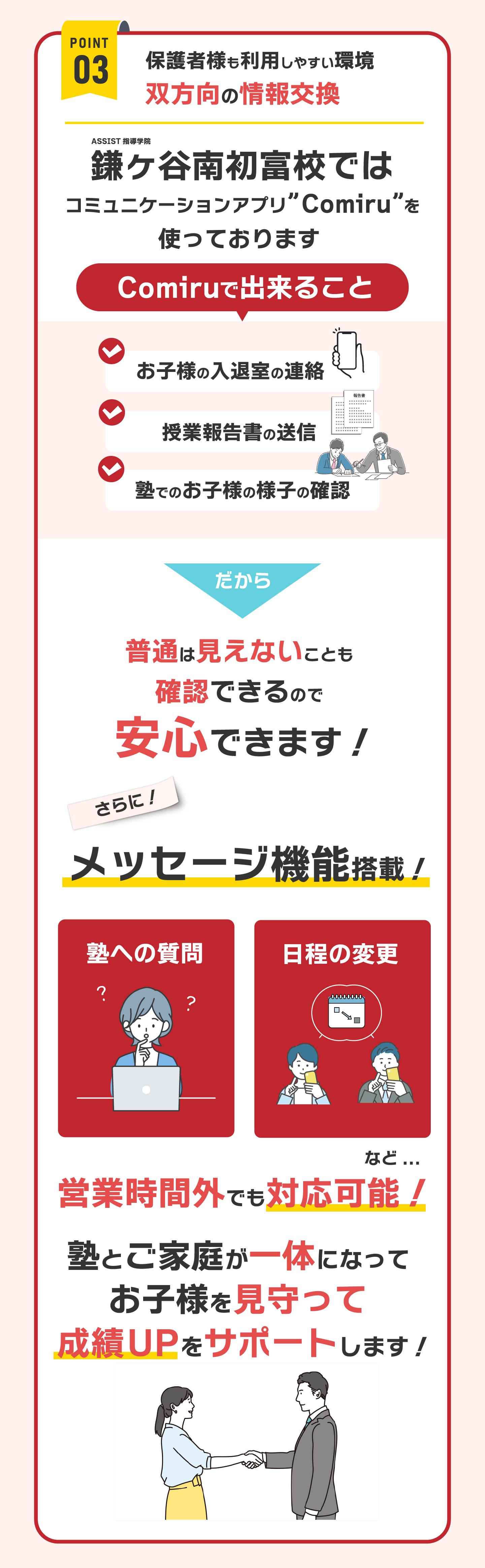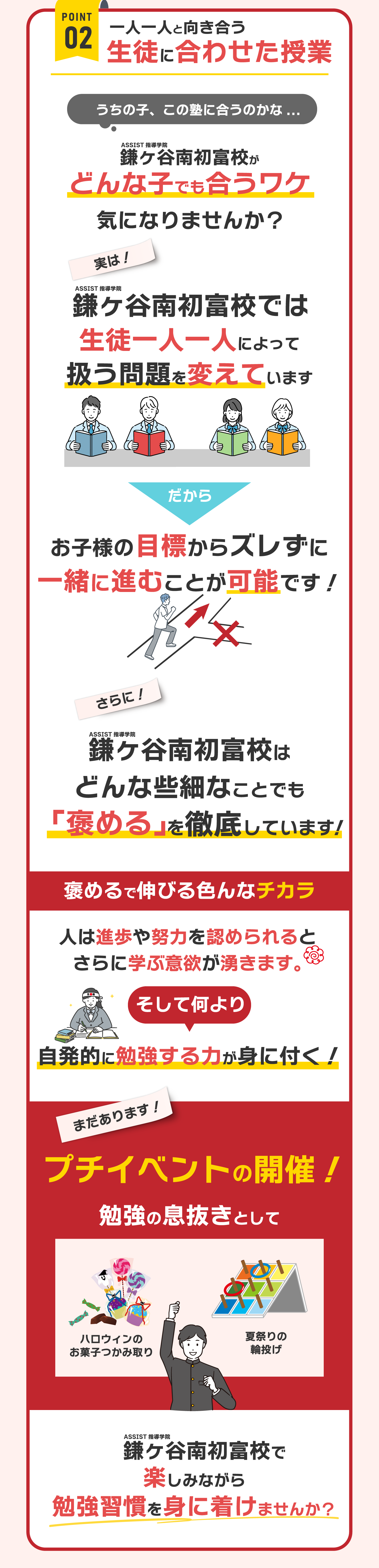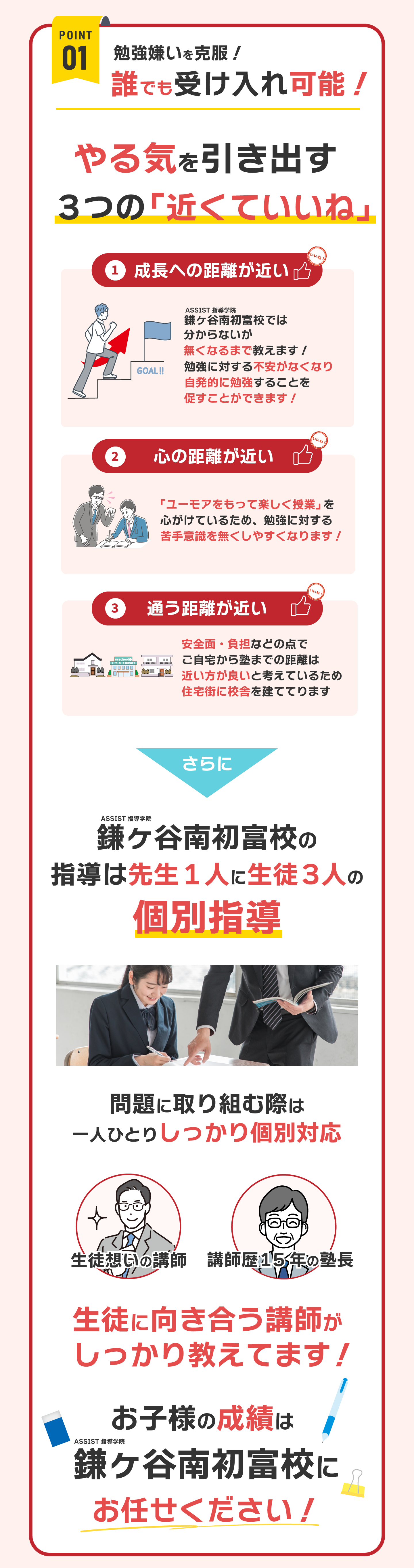 ASSIST指導学院鎌ケ谷南初富校 (以下「当社」)は、以下のとおり個人情報保護方針を定め、 個人情報保護の仕組みを構築し、全従業員に個人情報保護の重要性の認識と取組みを 徹底させることにより、個人情報の保護を推進致します。 個人情報の管理 当社は、お客さまの個人情報を正確かつ最新の状態に保ち、個人情報への不正アクセス・紛失・破損・改ざん・漏洩などを防止するため、セキュリティシステムの維持・管理体制の整備・社員教育の徹底等の必要な措置を講じ、安全対策を実施し個人情報の厳重な管理を行ないます。